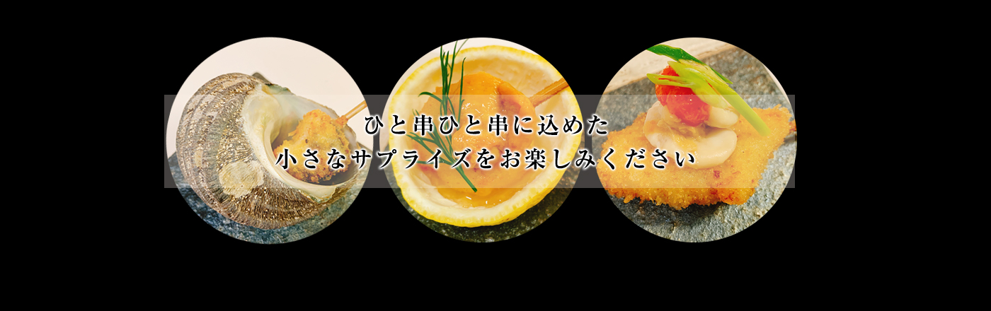 創作串揚げならではの食材のコラボとソースとのマリアージュ、そして一串一串に込めた小さなサプライズをぜひ当店でお楽しみください。
