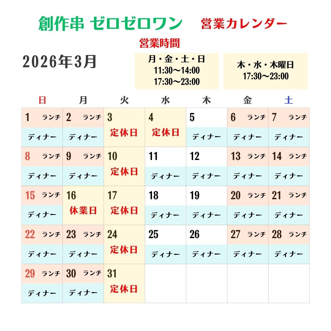 名張 居酒屋【創作串揚げ ゼロゼロワン】の2026年3月営業カレンダーのご案内ページです。